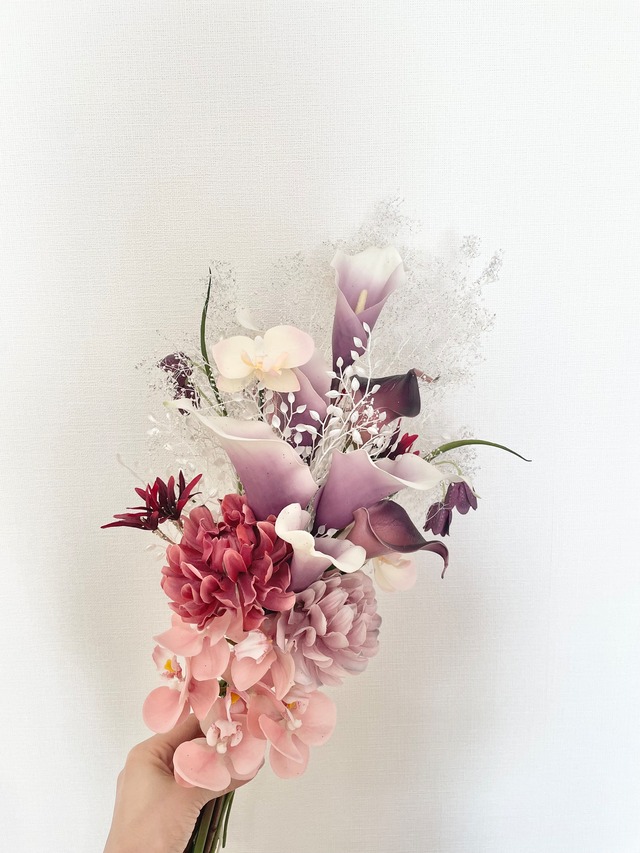 淡いピンクの胡蝶蘭 ダスティな色味のダリア グラデーションが美しいカラーリリー そのどれもが織りなす絶妙な色合いは甘い雰囲気でどこか夢のよう。 こちらのブーケのみプリザーブドフラワーを使用しており、白い小花の繊細さとグリッターが美しいブーケです。 アームブーケですがスタイリッシュすぎず、 チュールなどのふんわりとした素材のドレスとも 相性が良くなるようお仕立てしています。 サイズ(約):W35×H60