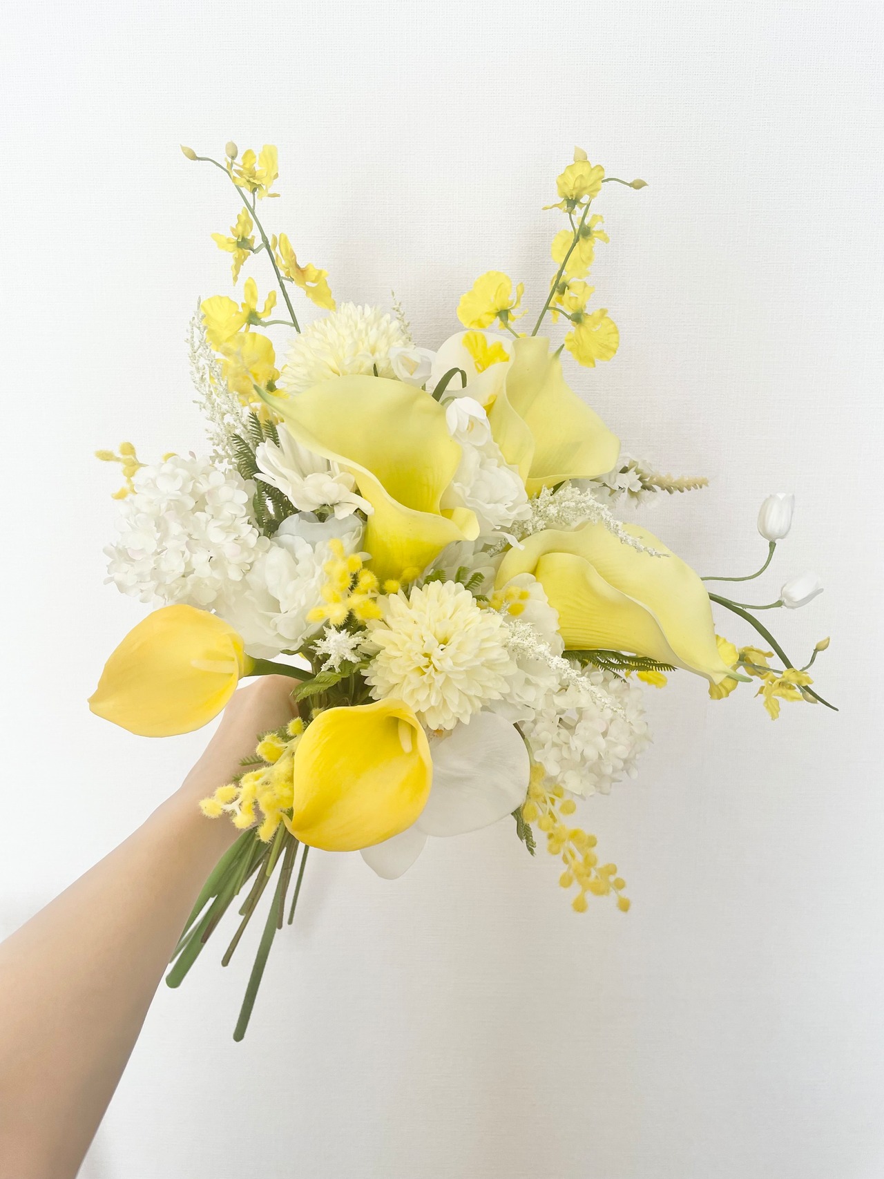 カラーリリーの周りのお花をぴょんぴょん飛ばすことで軽やかで楽しい雰囲気に。